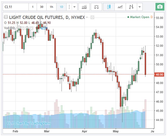 Le quotazioni del Petrolio negli ultimi giorni sono salite raggiungendo i 51,90 dollari per barile nel corso della mattina di oggi, prima delle notizie provenienti dal meeting OPEC. Nel momento in cui scriviamo i prezzi hanno raggiunto i 48,74 dollari per barile riportando i valori a metà maggio