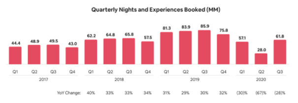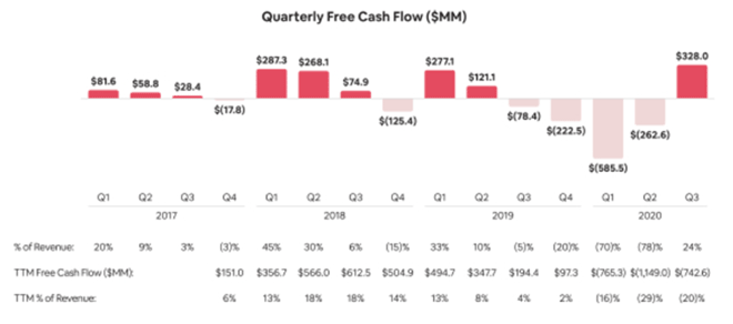 Le prenotazioni annuali hanno raggiunto i 326,9 milioni nel 2019, che sono quindi cresciute a un tasso del 31%, ma, a seguito della pandemia, il numero è sceso a soli 28 milioni nel secondo trimestre del 2020, un declino del 66,6% dallo stesso trimestre del 2019. Comunque, l’attività ha avuto una ripresa nel terzo trimestre e ha quasi raggiunto i livelli del terzo trimestre del 2018. La società ha registrato un free cash flow positivo per 4 anni prima della pandemia e, anche se nei primi due trimestri del 2020 è stato negativo, nel terzo trimestre la società ha prodotto un free cash flow di 328 milioni grazie a una forte ripresa, spendendo meno per il marketing e lasciando che il brand e la ripresa naturale svolgessero il loro lavoro.