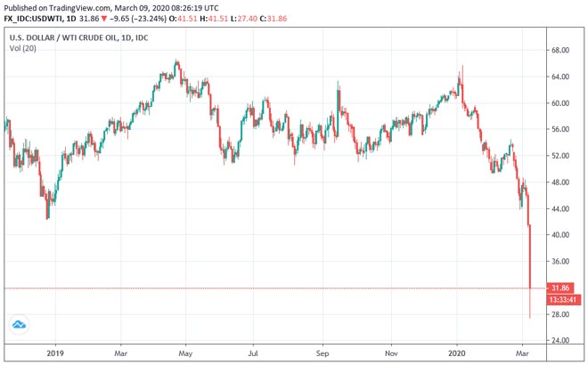 Il petrolio WTI è crollato di oltre il 30% per raggiungere i livelli più deboli da metà febbraio 2016 $ 27,34 dollari dopo che il sell-off accelerato con una rottura sotto il segno di 30 dollari, il livello psicologico importante.