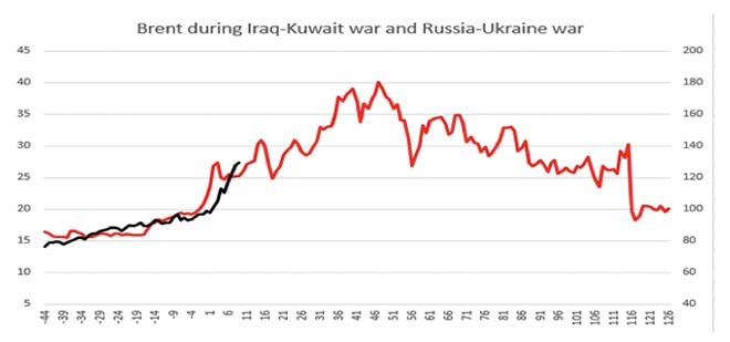 Circa 4,5 milioni di barili al giorno di petrolio sono stati “congelati” all'indomani dell'invasione irachena del Kuwait negli anni '90, ciò che all'epoca rappresentava circa il 7-8% della domanda globale. In teoria, la situazione attuale è molto simile. Sebbene la quantità di petrolio in pericolo sia inferiore, il rischio principale è che la maggior parte di questo petrolio sia stata esportata in Europa. I prezzi del petrolio sono aumentati del 140% dopo l'inizio dell'invasione irachena, ma sono tornati ai livelli pre-invasione in meno di un anno.