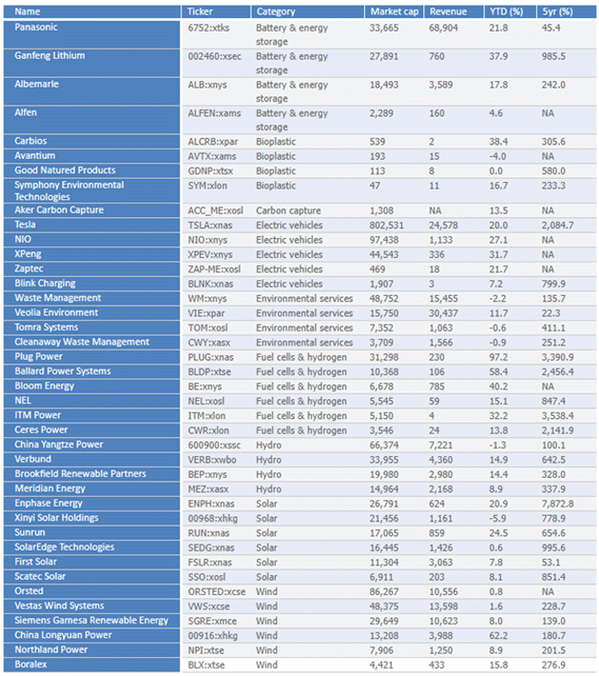 La seguente tabella mostra 40 titoli con esposizione a una serie di categorie legate a questo tema e che fanno parte di diversi settori che comprendono attività quali: produzione di batterie, stoccaggio di energia, produzione di bioplastica, cattura del carbonio, servizi ambientali, produzione di celle a combustibile e idrogeno, produzione di energia solare ed eolica.