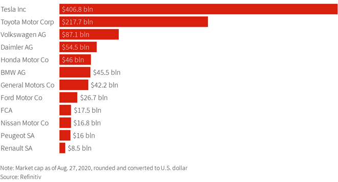 La giapponese Toyota e la tedesca Volkswagen AG hanno venduto rispettivamente 10,46 milioni e 11 milioni di veicoli durante l'anno finanziario 2019. Ciò si confronta con i 367.200 veicoli Tesla consegnati nel 2019.