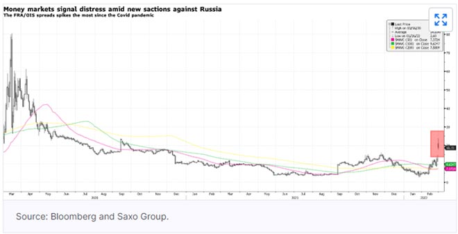 Questa mattina lo spread FRA/OIS ha aperto circa 10 punti base sopra la chiusura di venerdì alla notizia che nuove sanzioni escluderanno gran parte delle banche russe dal sistema SWIFT. L'implicazione di tali sanzioni potrebbe essere di vasta portata. Il guru del mercato monetario del Credit Suisse Zoltan Pozsar spiega che ciò potrebbe comportare mancati pagamenti e costringere la Fed ad aumentare l'offerta di moneta. Dice che circa 300 miliardi di dollari di valuta estera sono detenuti all'estero dalla Russia, abbastanza per sconvolgere i mercati monetari se congelati dalle sanzioni. In poche parole, l'unico modo per mantenere la stabilità dei mercati finanziari potrebbe essere che il bilancio della Fed si ingrandisca e rallenti il suo programma di rialzo dei tassi di interesse.