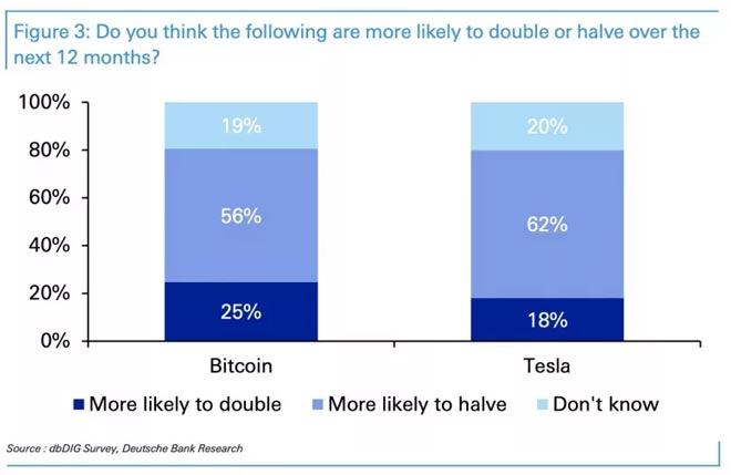 Di tutti gli intervistati, il 56% ritiene che Bitcoin abbia maggiori probabilità di dimezzare il suo valore nei prossimi 12 mesi. Un 62%, un numero ancora più grande, pensa che le azioni Tesla vedranno lo stesso calo (50%) nello stesso periodo.