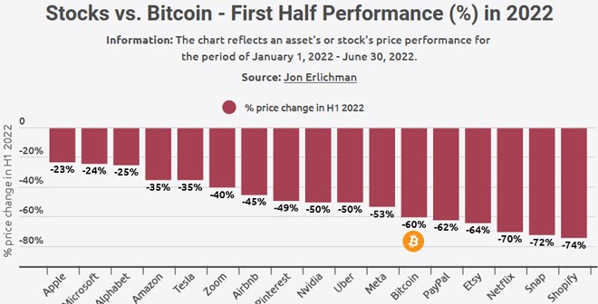 Questa l'analisi su come si è comportato il Bitcoin nel primo semestre 2022 rispetto ai principali titoli azionari americani e che cosa dovranno osservare nella seconda metà dell'anno.