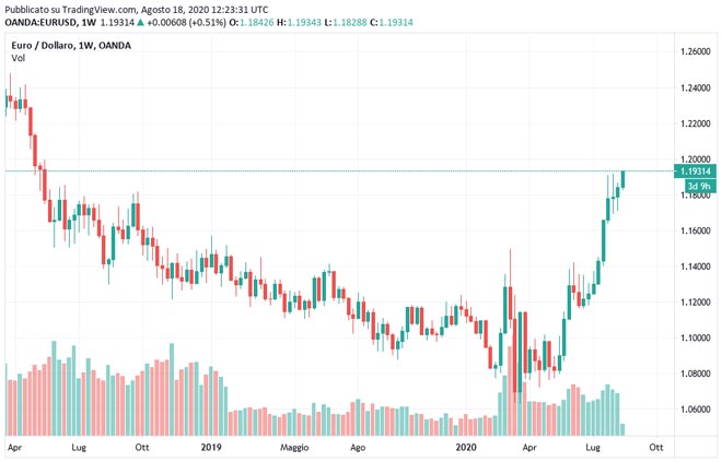 Lo slancio al rialzo del cambio EUR/USD rimane tutt'altro che attenuato per l'ennesima sessione di trading consecutiva. Con il rialzo di oggi, il cambio euro dollaro segna un nuovo massimo del 2020 a 1,19336. La moneta unica prosegue la sua corsa sulla scia del persistente deterioramento del biglietto verde, con il Dollari Index che sta navigando nell'area dei minimi degli ultimi 2 anni.