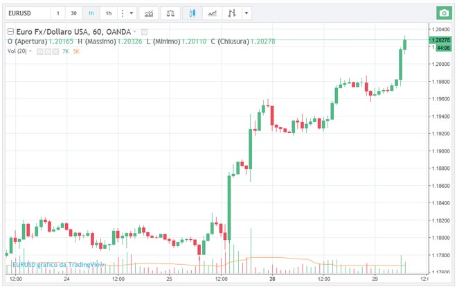 Il cambio euro/dollaro nel momento in cui scriviamo si trova a 1,2029 in rialzo dello 0,43%.