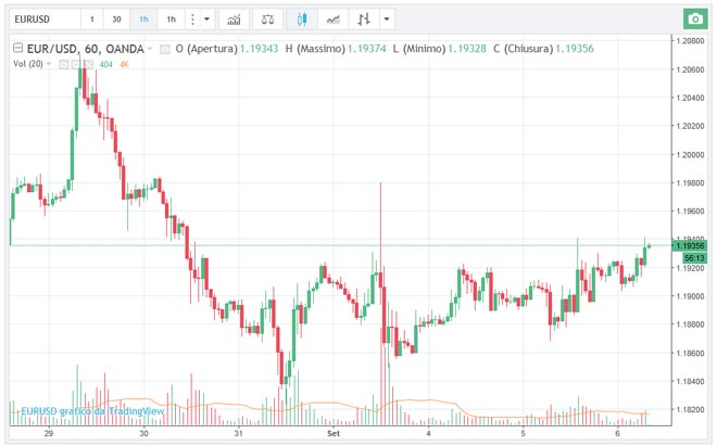 Inizio di settimana positivo per l'euro con il cambio salito sopra quota 1,1940 nei confronti del dollaro. Dai minimi di fini agosto l'euro sta proseguendo un lenta risalita che va a recuperare in parte le perdite che dal 29 al 31 agosto il cambio euro/dollaro è sceso dai massimi 1,207 fino al minimo a 1,1823.