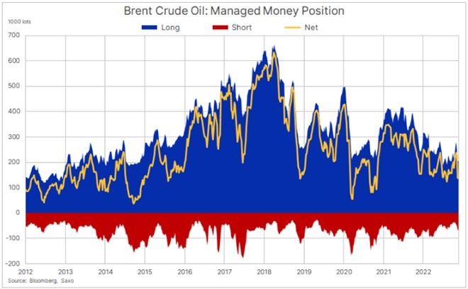 Prima del turnaround di lunedì, sia il Brent che il greggio WTI avevano visto un aumento delle vendite tecniche e momentum da parte dei money manager e – durante un periodo di tre settimane fino al 22 novembre – il long netto totale è stato ridotto del 31% a 310k lotti. Il colpo più duro è arrivato per il Brent, con le scommesse rialziste tagliate di un terzo o nel dettaglio da 71.000 lotti a 138.000 lotti.