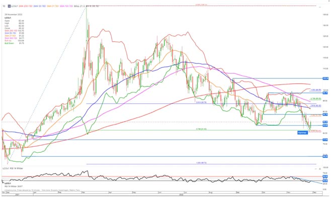 Il petrolio greggio ha effettuato una brusca inversione di marcia negli ultimi giorni con Brent e WTI che hanno registrato un calo di circa 19 dollari dall'inizio di novembre a causa delle continue e crescenti preoccupazioni sulle prospettive della domanda in Cina. Ad invertire la rotta è stata la speculazione secondo cui i Paesi dell'OPEC+, di fronte al rischio di un crollo più profondo e – a loro avviso – ingiustificato, sarebbero orientati ad effettuare tagli più profondi alla produzione. Decisione che potrebbe essere presa nei prossimi giorni.