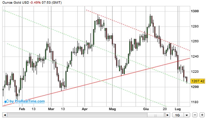 Nel momento in cui scriviamo l'ORO si trova a 1.207 dollari l'oncia in ribasso dello 0,34%.