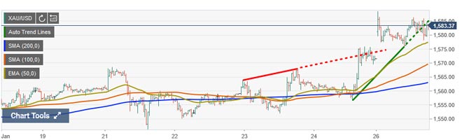 XAU/USD è scambiato in una tendenza rialzista al di sopra delle principali medie mobili giornaliere (SMA). Dopo aver trovato l'ostacolo dei 1.600 dollari all'inizio di gennaio, l'oro è prima sceso nelle regione 1.535 dollari per poi riguadagnare terreno.
