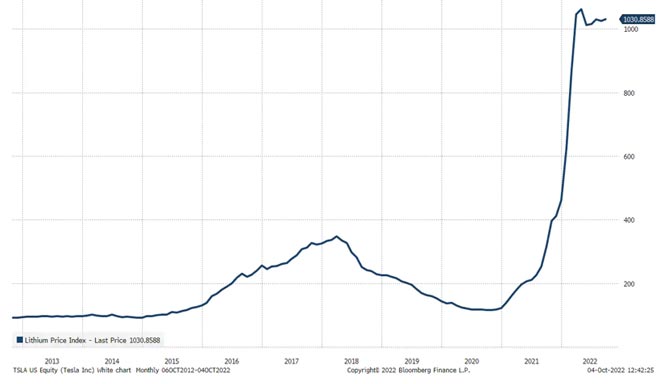 Inoltre, ci sono due ulteriori, forti ostacoli per la crescita di Tesla. Il primo è il prezzo del litio che rimane elevato e porta ad un aumento del costo delle batterie e quindi di quello dei veicoli elettrici. Questo significa che, data anche la curva di adozione prevista sui veicoli elettrici, siamo di fronte ad un mercato che potrebbe rimanere contratto per anni.