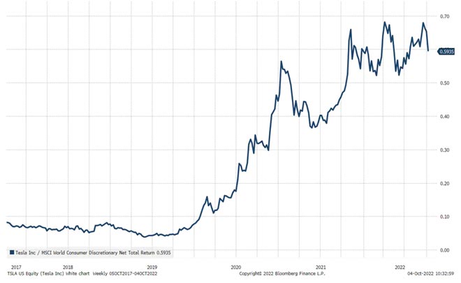 Non bastassero i problemi logistici nella catena di fornitura globale di automobili, ci sono altre due fonti di rischio. Finora, Tesla è stata immune dalla crisi del costo della vita causata dalla crisi energetica galoppante. Anzi. Nei mesi scorsi il titolo ha sovraperformato significativamente nel settore dei beni di lusso globali (vedi grafico sotto).