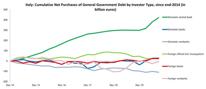 La base degli investitori del debito pubblico italiano è la più solida della periferia, in quanto ha la percentuale più bassa di investitori stranieri e la quota più alta di banche nazionali e soggetti non bancari che lo possiedono. Ciò che rende i titoli di stato italiani migliori dei pari è che gli investitori nazionali non speculativi con un orizzonte di investimento a lungo termine detengono la maggior parte del debito del paese.
