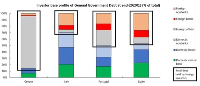 Una svendita del debito greco sarebbe immediatamente seguita dal debito portoghese e spagnolo poiché gli investitori stranieri detengono quasi la metà del debito di questi paesi.