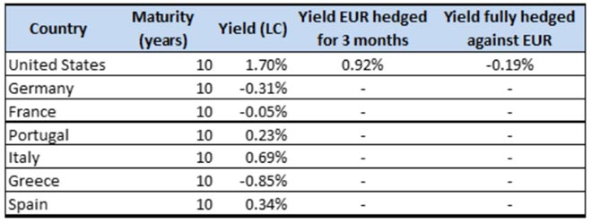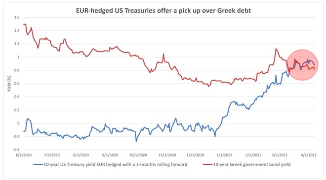 Per comprendere meglio i vantaggi che offrono i titoli del Tesoro statunitensi rispetto a quelli europei, è utile considerare un'altra strategia di copertura che prevede un contratto forward a tre mesi. In tal caso, al momento della scrittura, l'erosione dei rendimenti sarebbe sensibilmente inferiore e i titoli del Tesoro USA a 10 anni fornirebbero un rendimento di circa lo 0,92%, sette punti base sui titoli di stato greci a 10 anni.