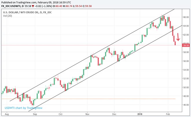 Come si può notare nel grafico qui sotto, la rottura al ribasso del livello di supporto ha alimentato una accelerazione del crollo dei prezzi. Il prossimo livello di supporto importante è a 58,90 dollari al barile, vedremo quindi presto se ci sarà una inversione di tendenza o un proseguimento ribassista.
