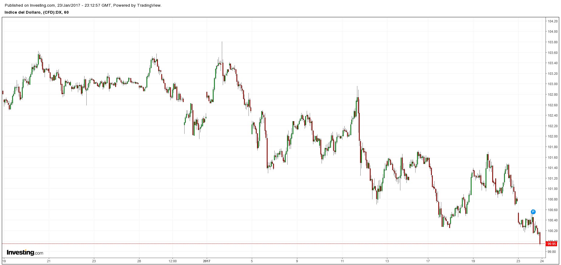Il Dollar Index, l’indice che misura il valore del biglietto verde in relazione al paniere delle altre principali valute, è sceso sotto i 100 punti, ad inizio mese l’indice del dollaro aveva toccato un massimo da 14 anni a 103,82 punti, sull’aspettativa che gli stimoli fiscali promessi da Trump. Quello che pesa sul Dollaro sono le incertezze legate ai programmi economici del presidente degli Stati Uniti, al momento non ancora forniti.