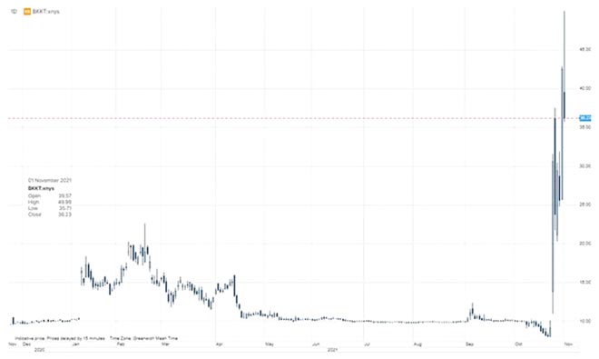 Bakkt è una piattaforma digitale per i consumatori, le imprese e le istituzioni finanziarie che vogliono impegnarsi in attività digitali sia che si tratti di acquistare criptovalute come Bitcoin, o pagare per beni e servizi in criptovaluta, o inviare denaro ad amici e familiari. L'azienda offre anche contratti futures e opzioni mensili su Bitcoin, e la custodia con International Exchange (il suo secondo maggiore azionista che possiede il 9,4%). L'azienda ha recentemente annunciato una partnership con Mastercard e Fiserv, suscitando un aumento dell'interesse e dei prezzi delle sue azioni del 280% in pochi giorni.