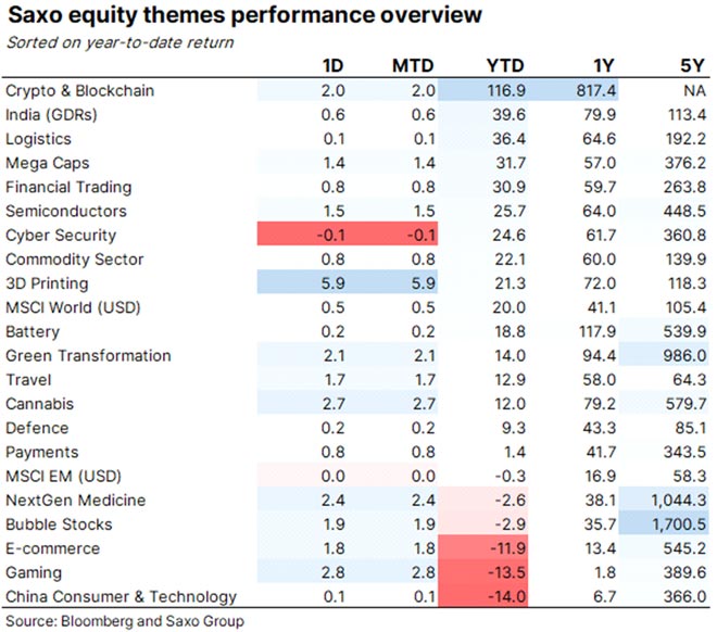 Il nostro paniere azionario Crypto & Blockchain si arricchisce di tre società e si compone ora di 26 società coprono il settore attraverso diverse attività. Si tratta di Bakkt Holdings, Stronghold Digital Mining e CoinShares International. Il nostro paniere Crypto & Blockchain rimane il più performante quest'anno con un aumento del 117% e rappresenta ora $143 miliardi di valore di mercato.