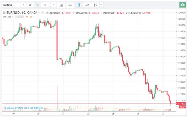 Il cambio euro/dollaro nel momento in cui scriviamo si trova a 1,17502 in ribasso dello 0,36%.