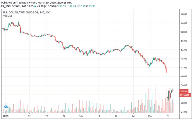 Il prezzo del petrolio (WTI) ha chiuso il primo giorno di contrattazione della settimana in calo di oltre il 27% dopo che l'Arabia Saudita e la Russia hanno dato il via a una guerra dei prezzi nel mercato petrolifero dopo non aver raggiunto un accordo sui tagli alla produzione la scorsa settimana.