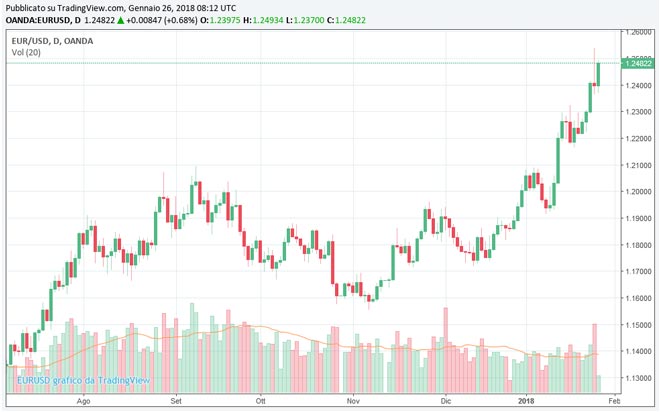 Prosegue questa mattina il rialzo del cambio euro/dollaro dopo aver raggiunto i massimi di dicembre 2014 ieri per poi ritracciare. Questa mattina il cambio si trova a 1,24834 in rialzo dello 0,87%.