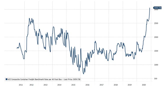Gli indici economici basati sul mercato non sembrano suggerire che ci sia inflazione, però, ci sono una serie di indicatori che dimostrano il contrario. Ad esempio, FedEx e UPS hanno recentemente avuto difficoltà di reperimento di un sufficiente numero di furgoni per le loro spedizioni last-mile di pacchi provenienti da società di e-commerce, aumentati notevolmente in termini di volumi per effetto del Covid-19. Inoltre, l’indice che traccia le tariffe per le spedizioni di merci sulle principali rotte mondiali, utilizzando come riferimento la tariffa per i container da 40 piedi, ci indica che i costi sono aumentati considerevolmente: del 112% dai minimi di quest’anno, dell’84% sopra il livello medio del 2011 e sono superiori ai livelli massimi raggiunti nel 2012. Questa inflazione reale è anche accompagnata da un aumento del prezzo di alcune materie prime, come ad esempio il rame che, spostandosi in backwardation, ci suggerisce che i prezzi delle materie prime potrebbero salire ancora di più.