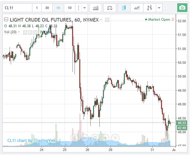 Le quotazioni del Light Crude Oil sono scese nel pomeriggio fino a 47,78 dollari al barile per poi recuperare in serata con i valori tornati sopra i 48 dollari per barile.