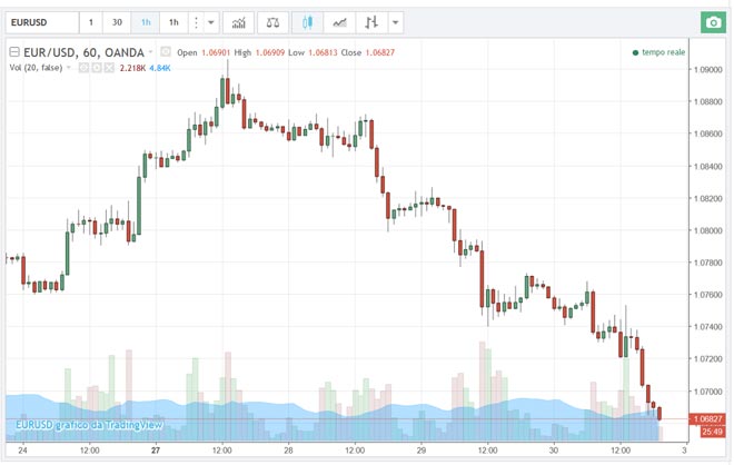 Il cambio Eur/Usd dopo aver superato quota 1,0900 ad inizio settimana, ha invertito la direzione mettendo a segno tre giorni con segno meno. Il cambio cambio Eur/Usd negli ultimi minuti è sceso sotto 1,0700 e precisamente a 1,06827.