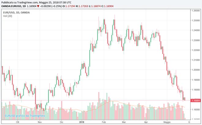 Nel momento in cui scriviamo il cambio eur/usd si trova a 1,1687 in calo dello 0,30%.