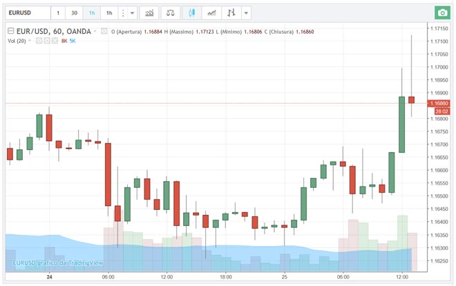 Il cambio euro/dollaro nel momento in cui scriviamo si trova a 1,16945 in rialzo dello 0,50%.