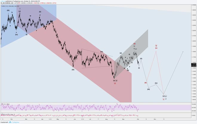 Il recente calo dell'Euro ha portato i prezzi al di fuori del canale di tendenza (colore grigio nel grafico a seguito). Questo è un segnale importante ed è probabile che la tendenza ribassista continui anche se non mancheranno rimbalzi in controtendenza. Rimaniamo con gli scenari rosso e nero, di cui abbiamo discusso qui nelle scorse settimane.