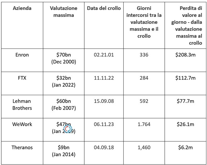 Nonostante la rapidità del suo declino, WeWork non detiene il primato della caduta più veloce. Al vertice di questa infausta classifica troviamo Enron, la cui capitalizzazione di mercato di 70 miliardi di dollari si è dissolta in un anno, travolta da scandali di frode e manipolazione contabile.