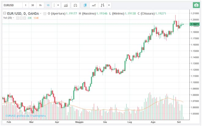 Il cambio euro/dollaro nel momento in cui scriviamo si trova a 1,1931 in rialzo dello 0,09%.