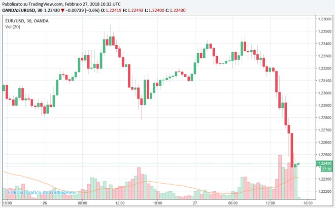 Per quanto riguarda il cambio euro/dollaro, si è passati dai 1,23466 ai 1,2215 nel pomeriggio di oggi. Nel grafico qui di seguito si evidenzia il movimento ribassista delle ultime ore.