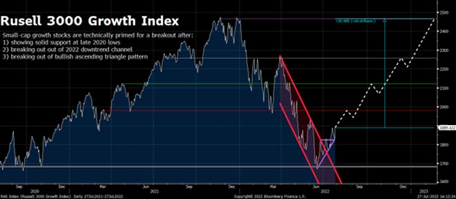 Il Russell 3000 Growth Index è la raccolta più completa di titoli a bassa capitalizzazione sul mercato. A giugno ha testato e mantenuto un livello di supporto critico per la fine del 2020. Poi a luglio è uscito dal suo canale di tendenza al ribasso del 2022. E solo pochi giorni fa, è scoppiato un modello a triangolo ascendente rialzista.