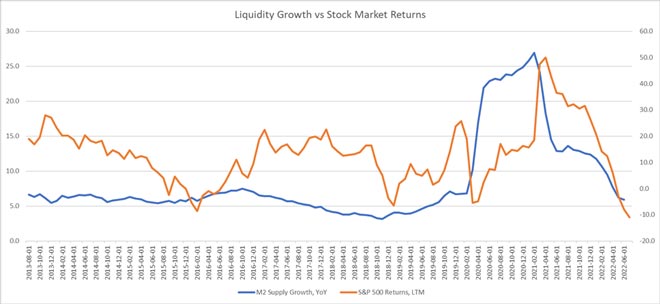 Quando l'espansione della liquidità è robusta, le azioni salgono. Quando l'espansione della liquidità si raffredda, le azioni scendono. Ciò è illustrato chiaramente nel grafico sottostante. Rappresenta il tasso di espansione anno su anno dell'offerta di moneta M2 rispetto ai rendimenti finali a 12 mesi dell'S&P 500.