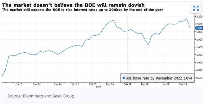 Dopo una BCE aggressiva la scorsa settimana, e una Federal Reserve aggressiva mercoledì, il mercato si aspettava che la Banca d'Inghilterra seguisse la stessa linea. Tuttavia, la BOE non si è unita al coro e ha spiegato che nonostante l'inflazione debba essere contrastata, la crescita del Paese sarà più importante nell’indirizzare le politiche monetarie. Si tratta di un enorme cambiamento rispetto alla riunione di febbraio, in cui quattro membri su nove avevano votato a favore di un aumento dei tassi di 50 punti base anziché di 25 punti base per combattere la crescita sostenuta dei prezzi. Come si può dedurre dalla sintesi della riunione di politica monetaria della BOE, un aumento del tasso di 50 pb è fuori discussione al momento poiché “il Comitato ritiene che nei prossimi mesi possa essere opportuno un modesto inasprimento della politica monetaria“. A febbraio, la stessa riga diceva che nei mesi successivi l'inasprimento era “probabilmente appropriato“. Tirando le somme, la BOE sta preferendo allentare lentamente gli aiuti all'economia poiché il rischio di stagflazione aumenta con un continuo aumento delle pressioni inflazionistiche e un crollo della crescita.