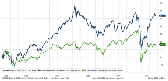 Come si può osservare dal grafico seguente, le azioni dei paesi emergenti hanno recuperato quasi completamente il loro valore in seguito al grande sell-off dovuto al Covid-19, mentre, per le azioni europee, il recupero è stato solo parziale. L'Asia, ed in particolare la Cina, che ha un peso specifico rilevante nell'indice dei mercati emergenti, sembra aver gestito molto meglio l'emergenza sanitaria garantendo la ripresa delle attività economiche in maniera molto più rapida. Purtroppo, durante il rimbalzo dei mercati europei, un nuovo aumento dei casi di Covid-19 ha interrotto il trend positivo e messo più pressioni sulla BCE.