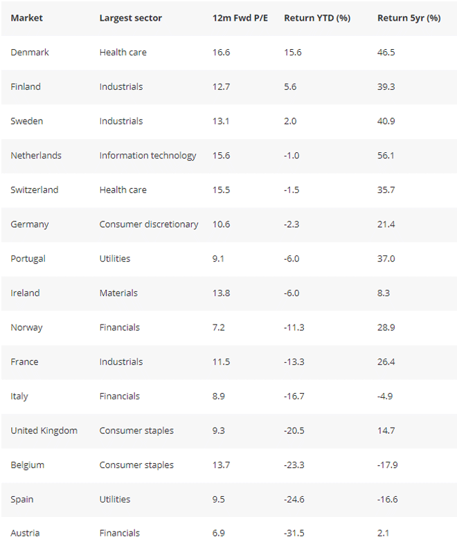Quindi, mentre il mercato delle azioni emergenti non ha subito particolari cambiamenti, le azioni europee sono ancora giù del 12% da inizio anno. Tuttavia, bisognerebbe fare distinzione tra due gruppi di mercati azionari europei in termini di performance: il primo, che è su dell'1% sulla base di un calcolo di peso ponderato, e comprende i mercati della Danimarca, Finlandia, Svezia, Olanda, Svizzera, Portogallo e Irlanda, ed il secondo, che è giù del 20%, e comprende anche l'Austria, che è la nazione più colpita da inizio anno (-31.5%).