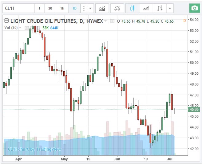 Nel momento in cui scriviamo il prezzo del petrolio si trova a 45,74 dollari al barile in rialzo dello 0,21%.