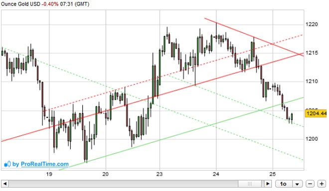 Durante le ore di trading di ieri, l’Oro ha ridotto il suo valore da 1.218,43 a 1.208,62 dollari l’oncia. Questa mattina il metallo prezioso si trova sopra quota 1.204 dollari, in prossimità di un livello di supporto importante a 1.200 dollari l'oncia.