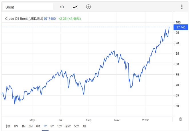 In effetti, il gas naturale europeo ha guidato i guadagni delle materie prime, con un'impennata fino al 13%. I costi tedeschi dell'elettricità e del carbone sono aumentati nello stesso momento in cui il petrolio greggio Brent si sta avvicinando a 100 dollari al barile.