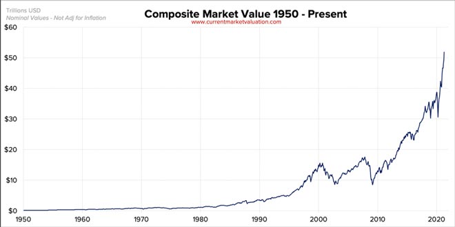 Current Market Valuation ha utilizzato l'indice Wilshire 5000, insieme ai dati della Federal Reserve per la componente storica, per misurare il valore collettivo del mercato azionario statunitense. Ecco uno sguardo al valore di mercato composito della nazione dal 1950: