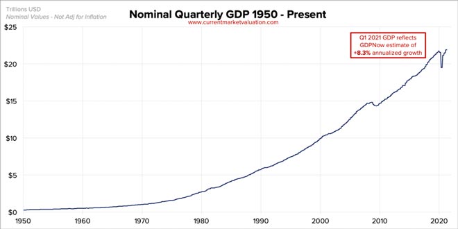 Sebbene i dati dell'Ufficio di presidenza siano pubblicati trimestralmente, non forniscono le cifre più recenti. Quindi, per trovare il PIL del primo trimestre del 2021, CMV ha utilizzato i dati della Federal Reserve Bank di Atlanta e ha ottenuto un PIL annualizzato di $ 21,9 t.
