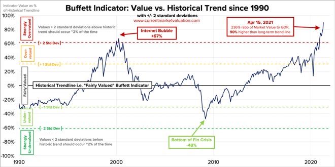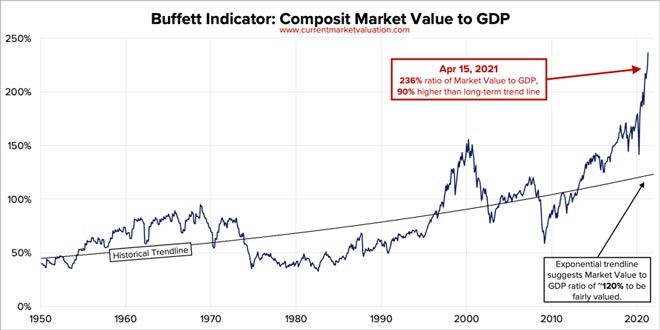 Questo rapporto, ora comunemente noto come indicatore Buffett, confronta le dimensioni del mercato azionario con quelle dell'economia. Un rapporto alto indica un mercato sopravvalutato e, dall'15 aprile 2021, il rapporto ha raggiunto i massimi storici, indicando che il mercato azionario statunitense è attualmente fortemente sopravvalutato.