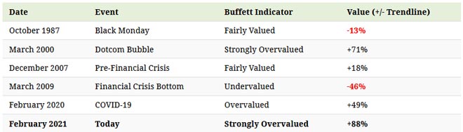 Ecco uno sguardo ad alcuni momenti storici nel mercato azionario e in cui all'epoca era valutato l'indicatore Buffett: