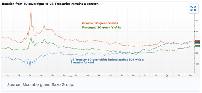 Come abbiamo evidenziato in un'analisi precedente, il rischio di rotazione dai titoli di Stato europei verso i Treasuries Americani rimane preoccupante. Anche se i rendimenti europei sono aumentati, il pick up che paesi come la Grecia offrono è marginale rispetto al rendimento fornito dai Treasuries USA con copertura in euro, pur portando evidenti problemi di liquidità e di credito. Se si considerano Portogallo e Spagna, il rendimento offerto dai Treasury americani con copertura in euro diventa ancora più attraente.